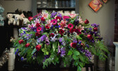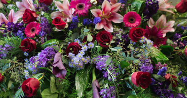 A beautiful array of pinks, purples and burgundys for a closed casket.