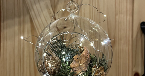This glass ball ornament comes with a little woodland creature, evergreens and a little sparkle to make your season festive.