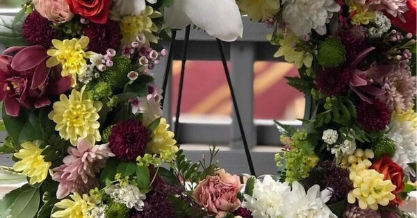 This mid-sized wreath featuring yellows and burnt orange is a lovely bright wreath for a celebration of life. Specify a colour theme and we can customize it for you.