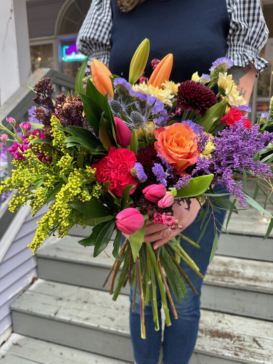 Some of our most colourful fall blooms thrown into a freshly wrapped bouquet. Lilies, gerberas, roses and mums as well as seasonally available blooms.