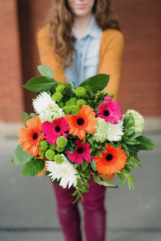 Please note that due to high volumes, this arrangement will look a little different. Some fun and fresh colours with some great contrast. Cabinet full of vases? This bunch will fit nicely into most vases you have at home. Just trim the stems!