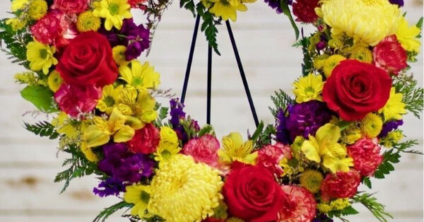 A heart wreath with a lovely assortment of flowers. Like a warm embrace. Comes with stand.