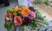 This contemporary asymmetrical arrangement features roses, gerbera, long-lasting dianthus and mums, along with some cute accents of wheat and solidago.