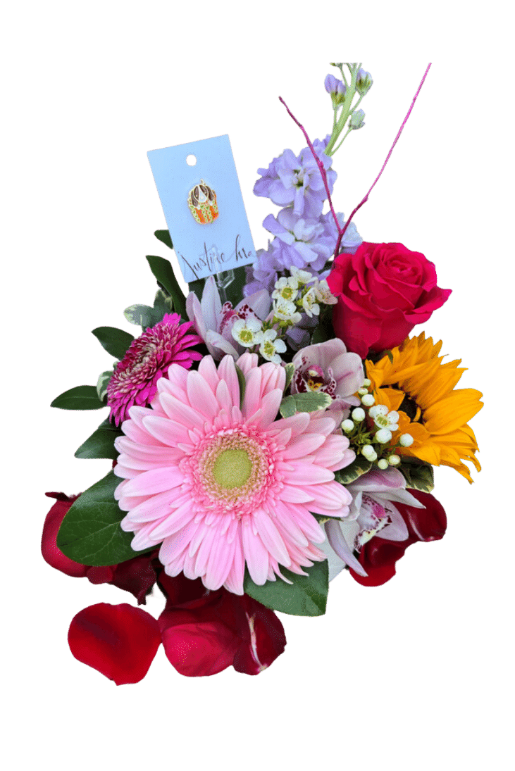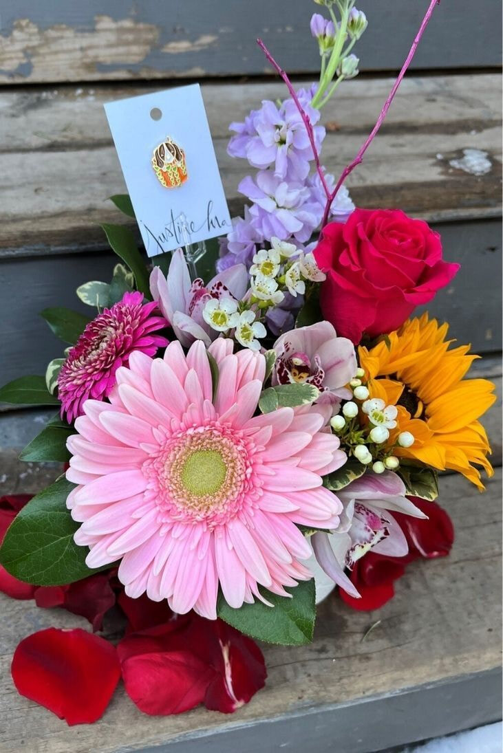 A fun little Dog Safe bouquet in a container with a super cute pin from local designer Justine Ma! No trips to the vet for your beloved fur baby with this bouquet.