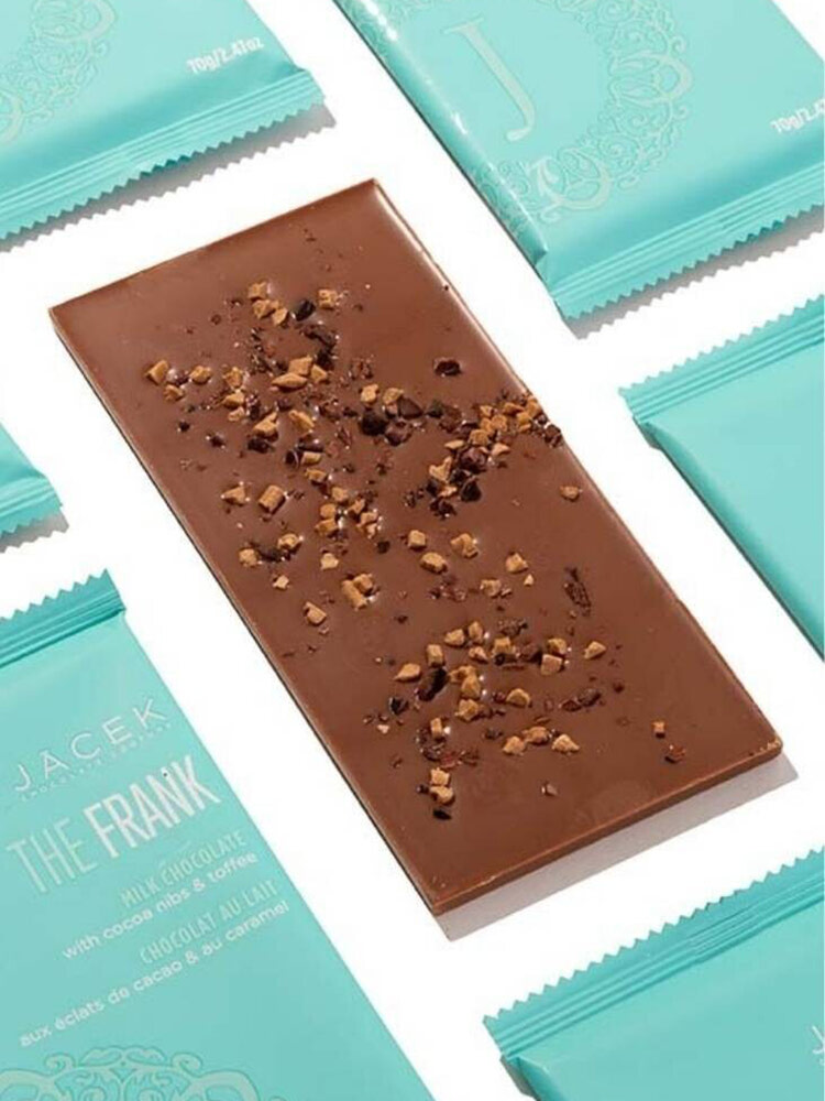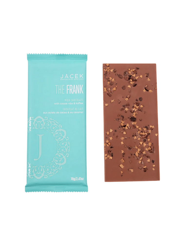 The Frank showcases the potential of adventurous fashion accessories. Like a stylish hat or a striking tie, this milk chocolate bar is given a unique twist with the bold flavours of toffee & cocoa nibs.