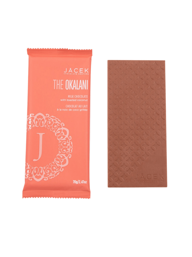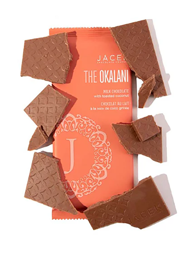 We are thrilled to carry locally-made Jacek Chocolate Couture bars year-round! The Okalani is a milk chocolate bar with toasted coconut.