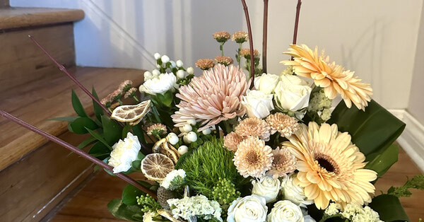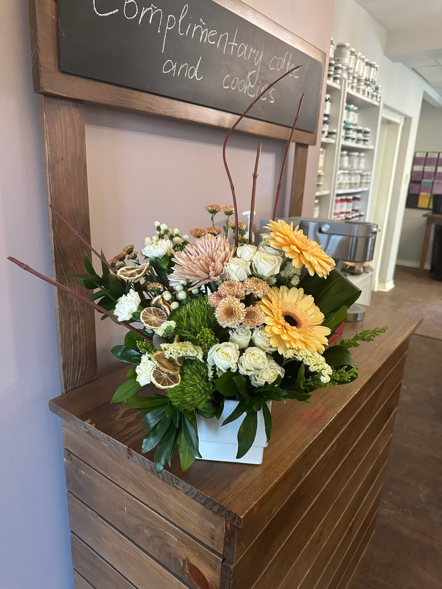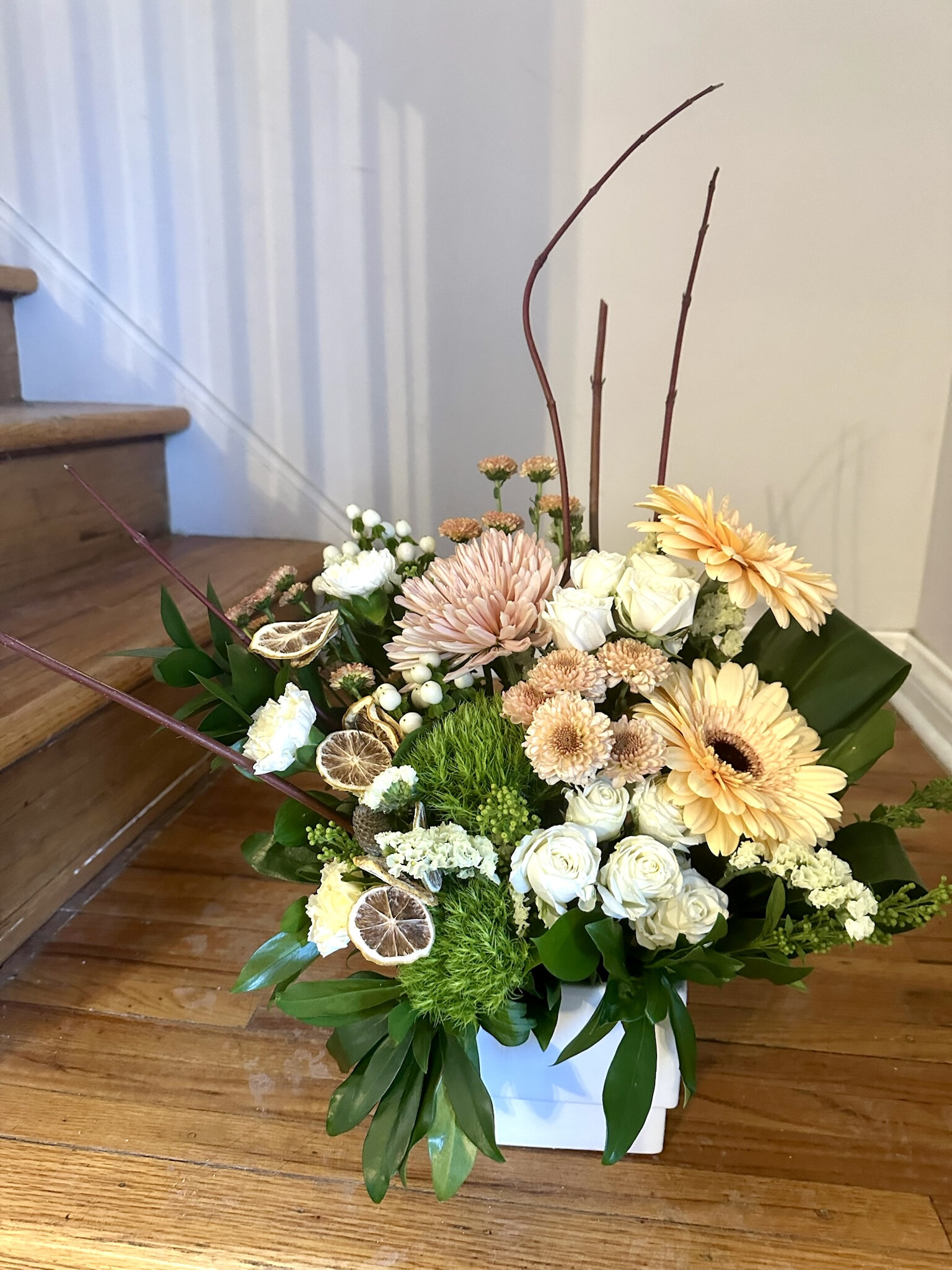 Accents of green trick dianthus bring vibrant texture, while dried citrus slices and sculptural curly willow branches add an organic, contemporary edge. Lush seasonal greenery completes the look, all thoughtfully arranged in a sleek white keepsake container for a polished finish.