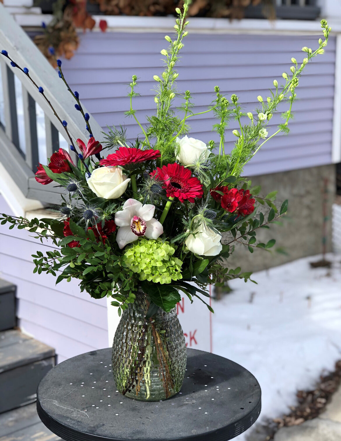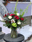 A fun bright Holiday arrangement with greens and reds with touches of elegance.