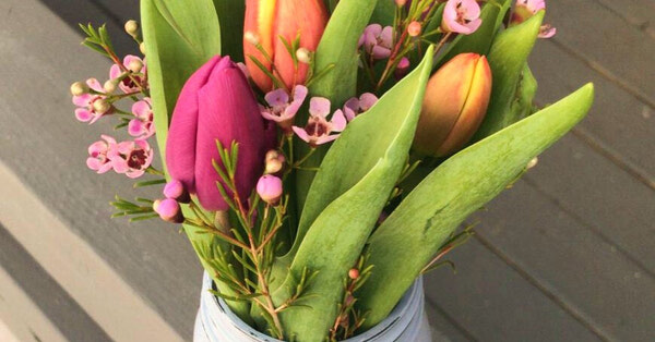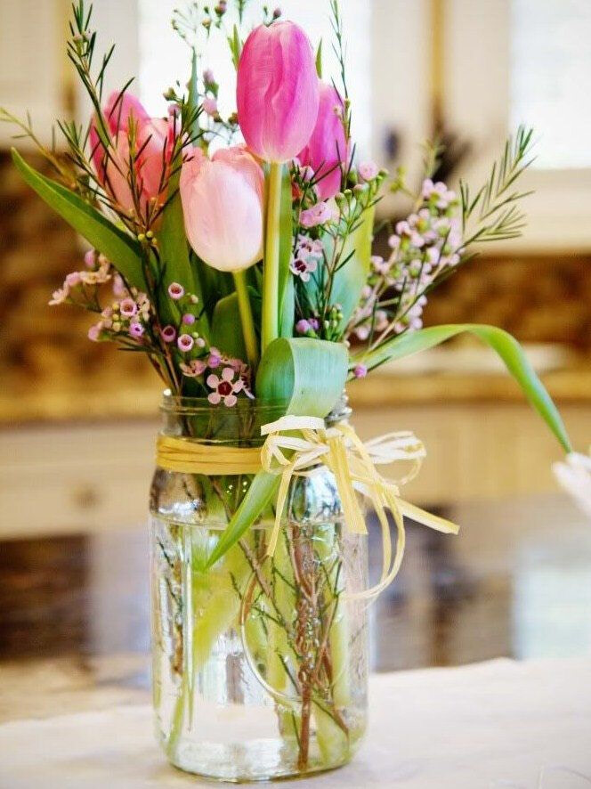 Tulips! A sweet mini jar with some tulips and fillers! Colours will vary, please specify colour choice if specific. Add $5 or painted jar.