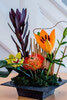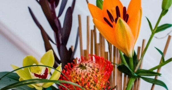 Simple, unconventional floral arrangement featuring Lilies, Pincushion Protea, a Cymbidium Orchid and Bamboo. Colours vary with availability.