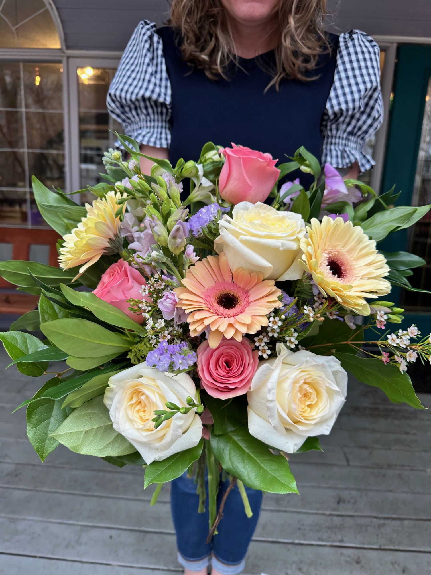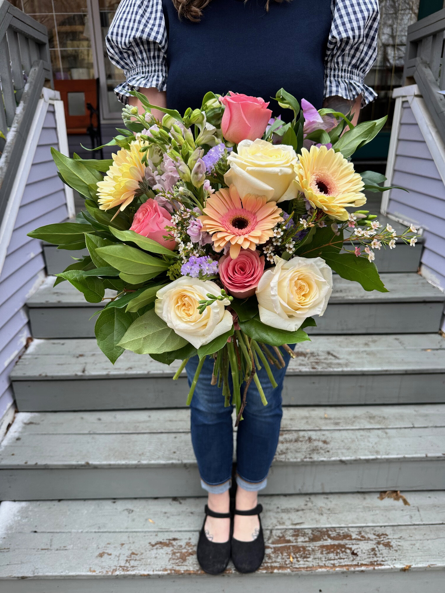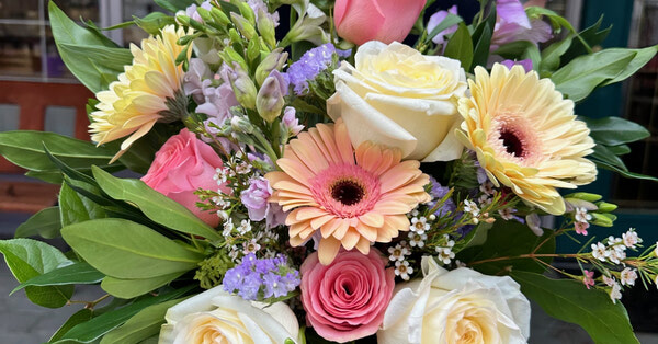 This bouquet is a lovely collection of roses, and playful gerbera daisies, complemented by playful spring fillers and greenery. It's a hand-held celebration, artfully designed to bring joy and a splash of vivacity to any space or occasion. *Hand-tied bouquet