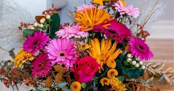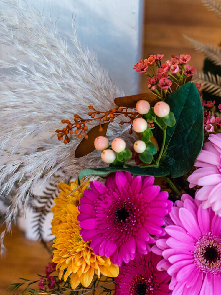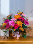 This artistic arrangement features pinks and fall tones. The sweeping line of the silhouette keeps it modern and makes a statement, but it's the perfect size for an end table at home. Featuring gerberas, roses, mums and pampas grass!