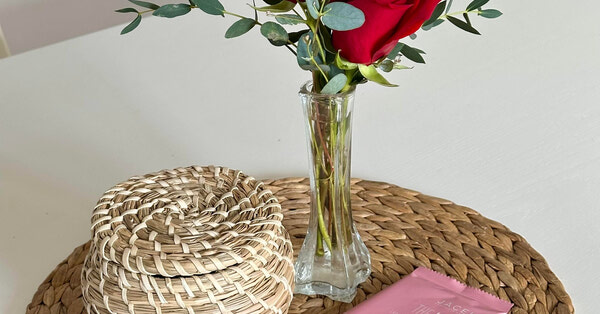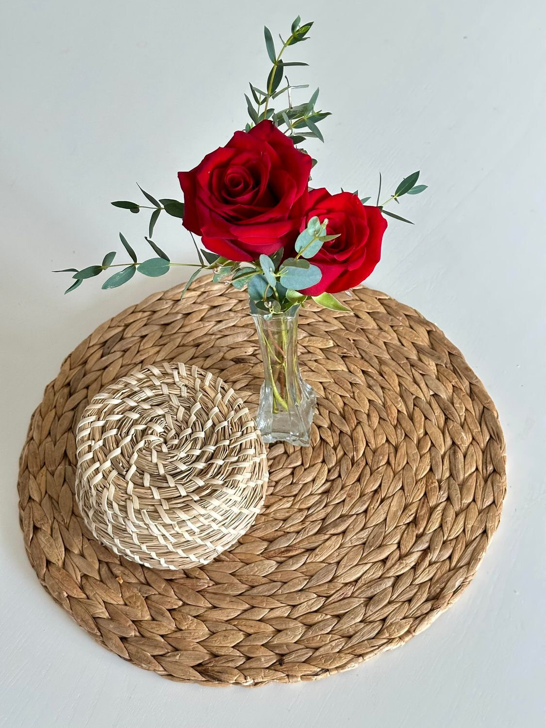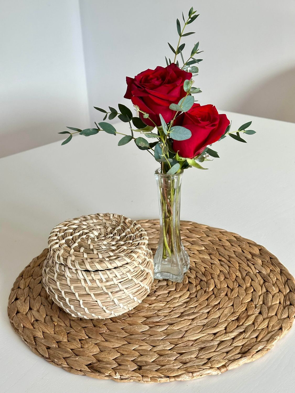 Simplicity meets elegance with our Petite Romance bud vase. Featuring two vibrant red roses accented with delicate eucalyptus, it's a charming gesture for someone special or a delightful addition to your own space.