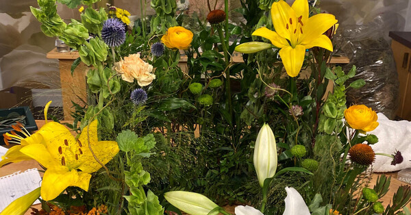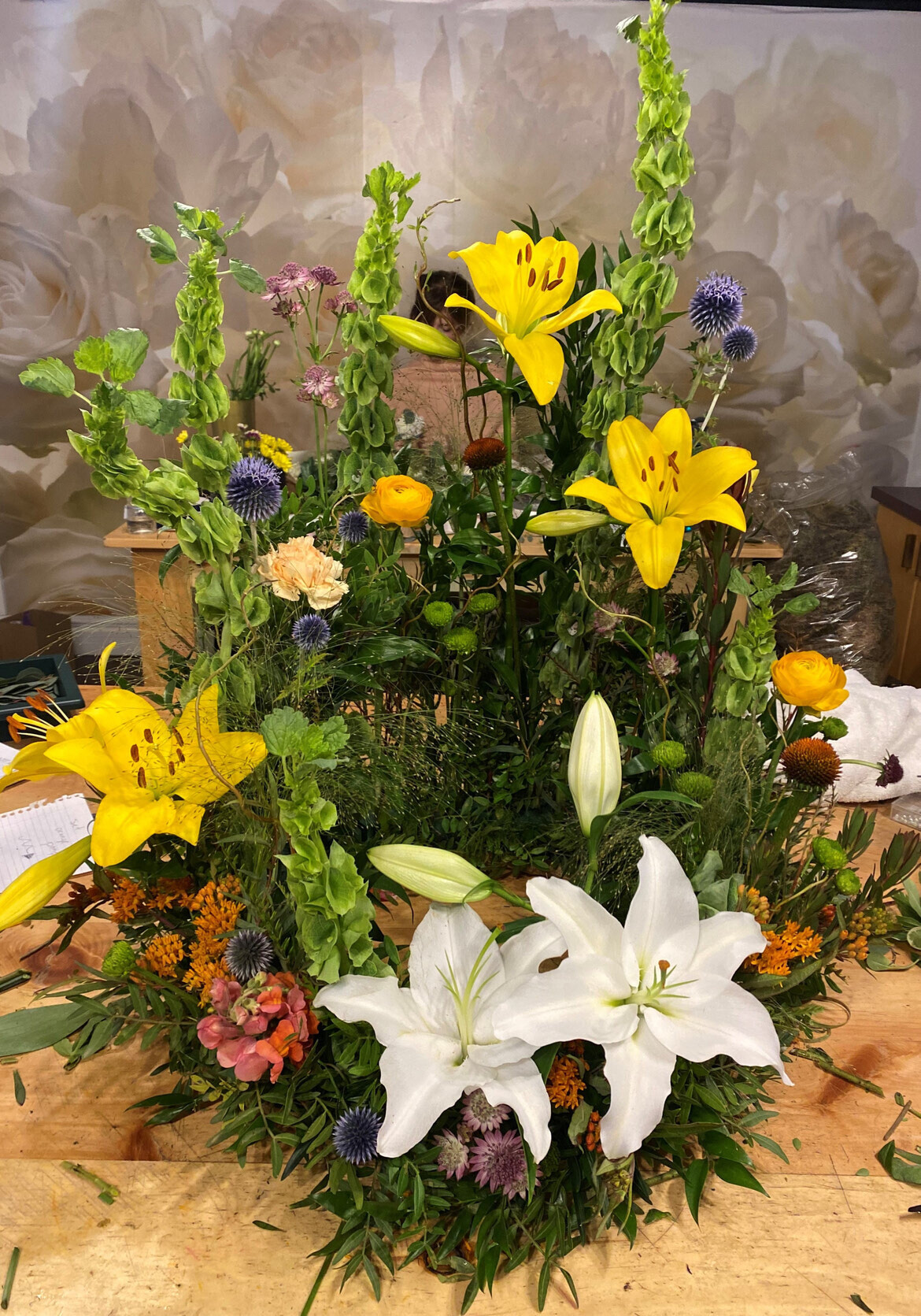 This rustic urn wreath with vibrant hues of blues and yellows is a perfect goodbye. This wreath is to lovingly hold an urn and be placed on a flat surface.