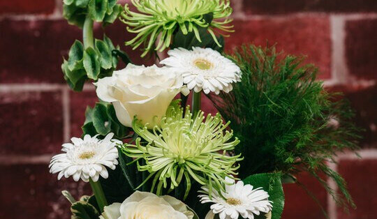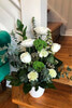 A soothing blend of soft greens and crisp whites, this arrangement offers a sense of calm and quiet beauty—perfect for bringing comfort and peace to any space or occasion.