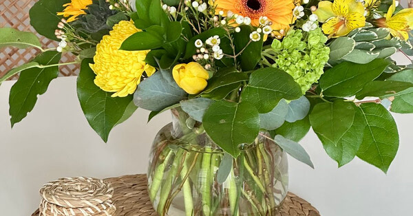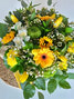 Brighten someone's day with this sunny arrangement featuring vibrant yellow gerbera daisies, tulips, mums, and lush greenery. Presented in an elegant glass vase and paired with a delightful Jacek chocolate bar, this cheerful bouquet is perfect for birthdays, celebrations, or simply to share some joy and warmth.