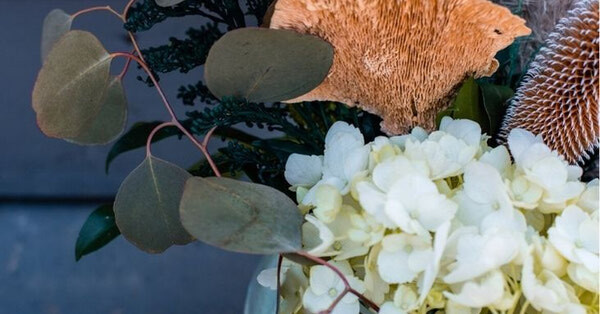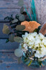 This clear bowl has a mixture of fresh and dried flowers—pretty teal and caramel tones. Flowers may vary from photo.