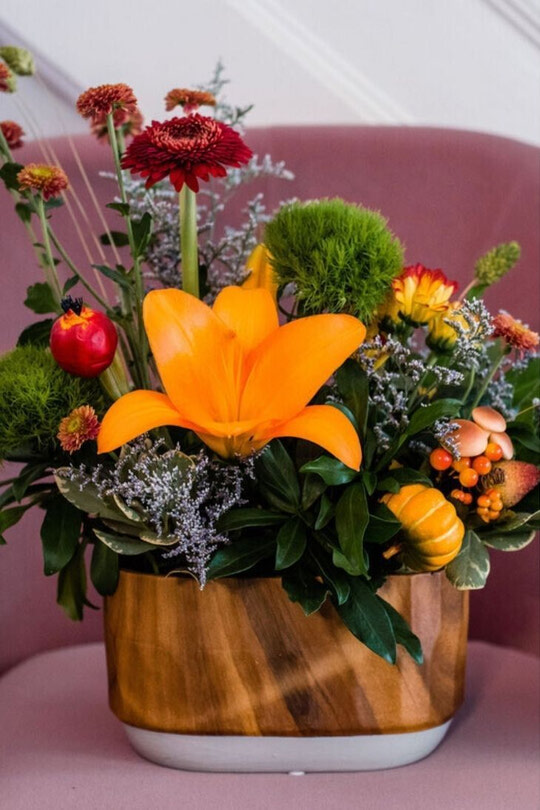 This contemporary asymmetrical arrangement features lilies, gerbera, long-lasting dianthus and mums, along with some cute artificial fruit or pumpkins.