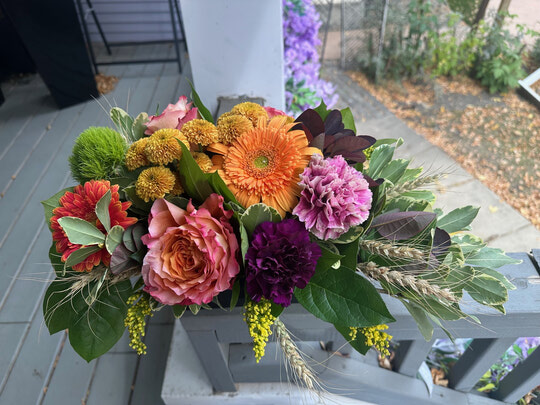 This contemporary asymmetrical arrangement features roses, gerbera, long-lasting dianthus and mums, along with some cute accents of wheat and solidago.