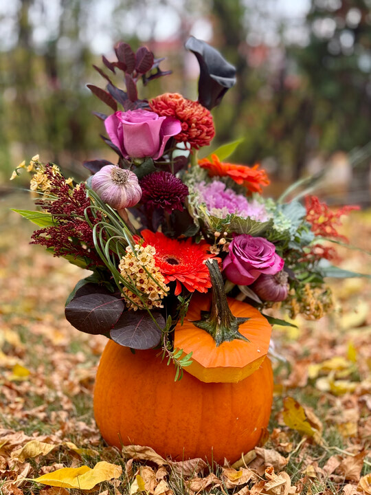 A lush and full arrangement composed of deep fall coloured flowers. It contains Roses, Oriental Lily, Gerbera Daisies, daisies, filler flowers and a mini pumpkin.
