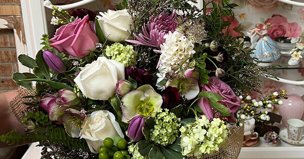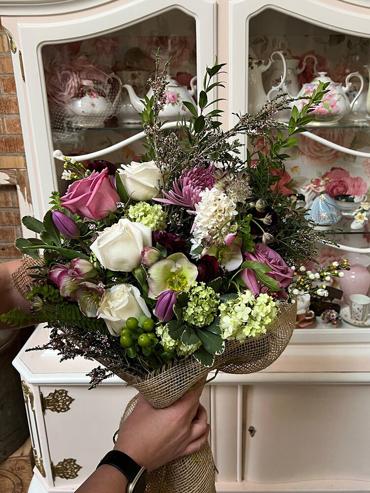 Behold 'The Gloria' Bouquet: A sophisticated and elegant composition reminiscent of Gloria's timeless Art of Cake. This bouquet boasts classic roses and delicate hydrangeas, accented by the subtle drama of dark calla lilies and a hint of verdant blooms. Wrapped in burlap for a touch of rustic charm, it's a floral masterpiece that conveys refined grace and style
