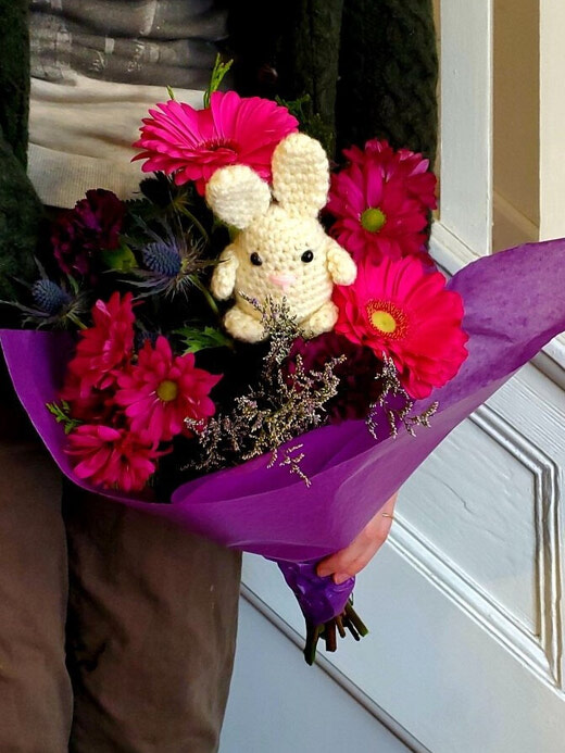 Assortment of mixed flowers. This hand-crocheted bunny is made with love! Bunny comes in white, pink or purple. **While supplies last. The flowers may not be the same colours as the photo.