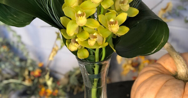 A lovely vase with some rolled leaves and grasses with mini cymbidium orchids as the central. These natural colours of orchids come in green, yellow, whites, pinks and seasonal colours.